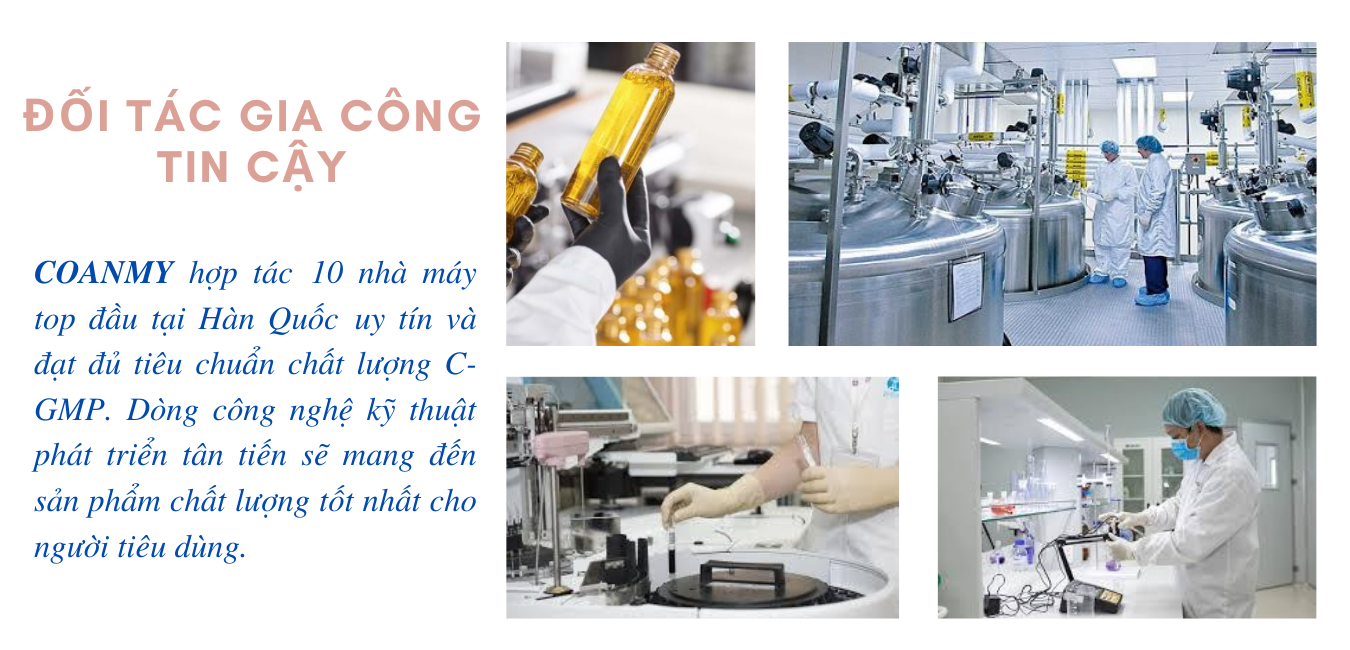 COANMY hợp tác với 10 nhà máy top đầu tại Hàn Quốc uy tín và đạt đủ tiêu chuẩn chất lượng C-GMP. Dòng công nghệ kỹ thuật phát triển tân tiến sẽ mang đến sản phẩm chất lượng tốt nhất cho người tiêu dùng.